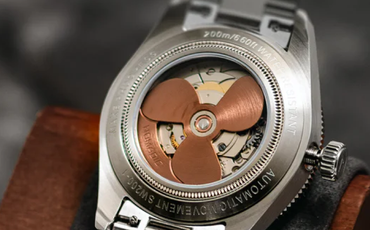 The sapphire caseback to reveal a delightful and distinctive rotor, inspired by the propellors of the SS Nomadic and RMS Titanic.